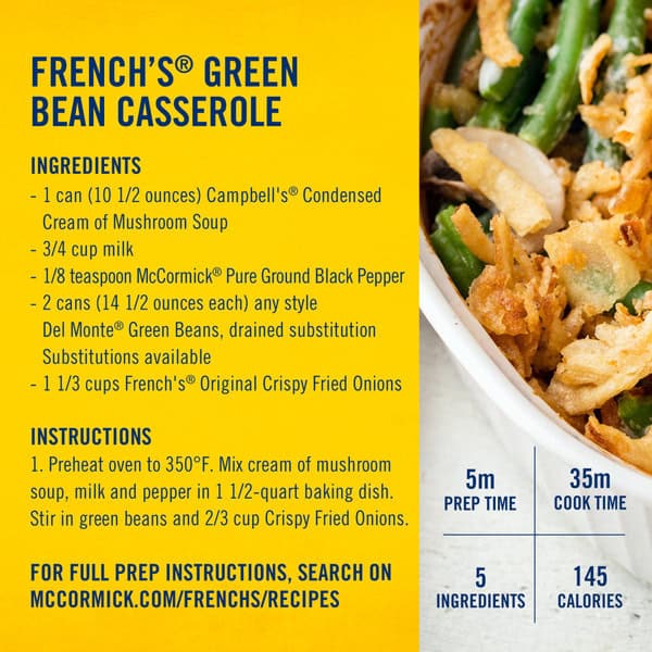 No preparation necessary. To enjoy French’s Original Crispy Fried Onions, open container and sprinkle over green bean casserole, mashed potatoes, burgers, salads, and more.