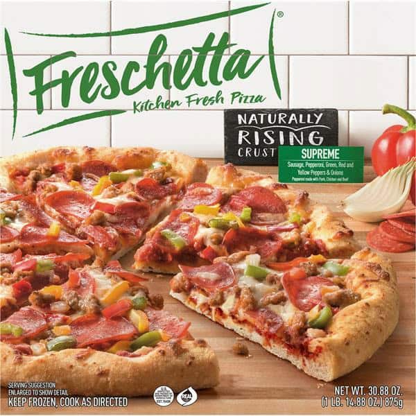 FRESCHETTA Naturally Rising Supreme Frozen Pizza – The team at FRESCHETTA Pizza takes making premium pizza seriously. We are undeniable foodies who pour our souls into crafting the best tasting, highest quality frozen pizza. We use premium ingredients to create our scratch-made naturally rising crust that brings the welcoming smell of freshly baked bread into your kitchen as it rises. FRESCHETTA Supreme frozen pizza is covered in 100% real mozzarella cheese, flavorful tomato sauce, sausage, pepperoni, green, red & yellow bell peppers and onions creating a what a premium pizza should be. Passionately uncompromising. FRESCHETTA frozen pizza is premium pizza perfection. Bake our frozen pizza in the oven at 400°F for 26-30 minutes and let the enticing aromas fill your home. Our thoughtfully crafted frozen pizza is artfully created so that you can serve wine night snacks or game-day party food that meet the standards of even the most discerning pizza experts. For over 20 years, we have been passionately dedicated to creating unparalleled premium frozen pizza perfection, because great pizza deserves the best ingredients and uncompromising dedication. Feed your passion and taste the difference yourself with FRESCHETTA frozen pizzas.