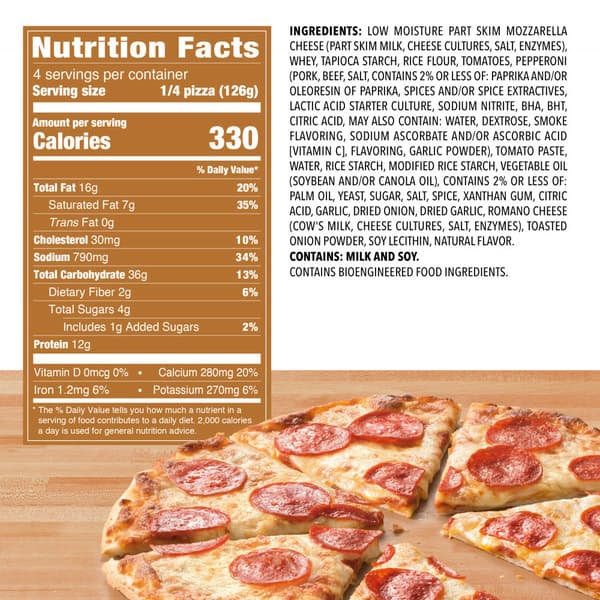 Low Moisture Part Skim Mozzarella Cheese (part Skim Milk, Cheese Cultures, Salt, Enzymes), Whey, Tapioca Starch, Rice Flour, Tomatoes, Pepperoni (pork, Beef, Salt, Contains 2% Or Less Of: Paprika And/or Oleoresin Of Paprika, Spices And/or Spice Extractives, Lactic Acid Starter Culture, Sodium Nitrite, Bha, Bht, Citric Acid, May Also Contain: Water, Dextrose, Smoke Flavoring, Sodium Ascorbate And/or Ascorbic Acid [vitamin C], Flavoring, Garlic Powder), Tomato Paste, Water, Rice Starch, Modified Rice Starch, Vegetable Oil (soybean And/or Canola Oil), Contains 2% Or Less Of: Palm Oil, Yeast, Sugar, Salt, Spice, Xanthan Gum, Citric Acid, Garlic, Dried Onion, Dried Garlic, Romano Cheese (cow’s Milk, Cheese Cultures, Salt, Enzymes), Toasted Onion Powder, Soy Lecithin, Natural Flavor.