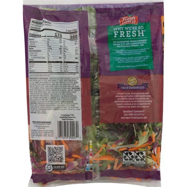 Vegetables: Baby Spinach, Red Cabbage, Carrots, Baby Green Leaf Lettuce, Baby Tango Lettuce, Baby Green Oak Lettuce, Baby Lollo Rossa Lettuce, Baby Red Leaf Lettuce, Baby Red Oak Lettuce, Baby Mizuna, Baby Arugula, Baby Beet Tops, Baby Butter Lettuce, Baby Chard, Baby Kale, Baby Pak Choi, Baby Tatsoi, Endive, Frisee, Radicchio. Ingredients May Vary, Ingredients May Vary, Dressing: Sugar, Vegetable Oil (canola And/or Soybean Oil), Water, Tomato Paste, Blue Cheese (milk, Salt, Culture, Enzymes), Apple Cider Vinegar, Distilled Vinegar, Less Than 2% Of Salt, Paprika, Xanthan Gum, Dried Garlic, Dried Onion, Chili Powder (spices, Salt, Paprika, Dried Garlic), Cheese: Blue Cheese (pasteurized Milk, Cheese Culture, Salt, Enzymes, Penicillium Roqueforti), Powdered Cellulose (to Prevent Caking), Garlic Brioche Croutons: Enriched Flour (wheat Flour, Malted Barley Flour, Niacin, Iron, Thiamine Mononitrate, Riboflavin, Folic Acid), Sunflower Oil (sunflower Oil, Rosemary Extract [to Maintain Freshness]), Seasoning (garlic Powder, Sea Salt), Palm Oil, Cane Sugar, Sea Salt, Yeast