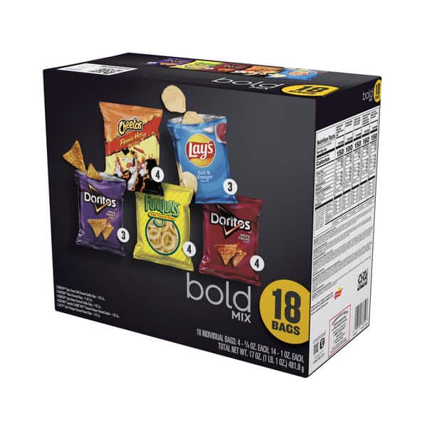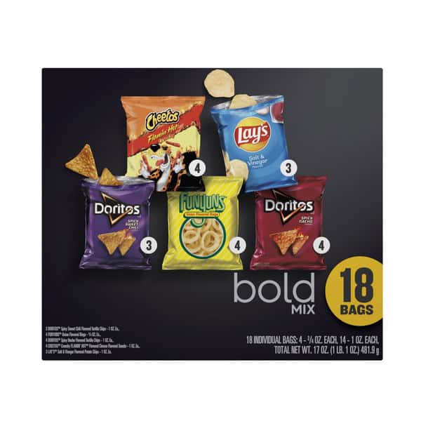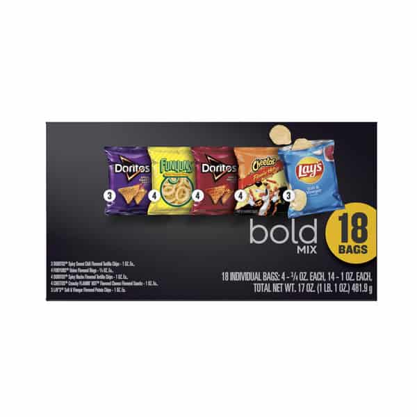 • Includes 18 Frito Lay Snacks Bold Mix Variety Pack: (3) Doritos Spicy Sweet Chili, (4) Funyuns Onion Flavored Rings, (4) Doritos Spicy Nacho, (4) Cheetos Crunchy Flamin’ Hot and (3) lay’s Salt & Vinegar