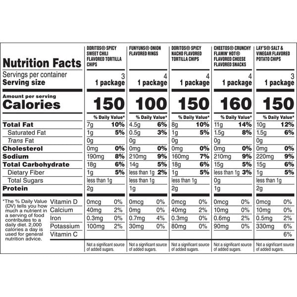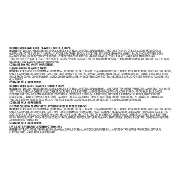 Doritos Spicy Sweet Chili Flavored Tortilla Chips Ingredients: Corn, Vegetable Oil (corn, Canola, Soybean, And/or Sunflower Oil), And Less Than 2% Of Corn Maltodextrin, Sugar, Salt, Hydrolyzed Corn Protein, Sodium Diacetate, Onion Powder, Monosodium Glutamate, Potassium Salt, Natural Flavors, Garlic Powder, Malic Acid, Yeast Extract, Paprika Extracts, Spices, Disodium Inosinate, Disodium Guanylate, And Stevia Leaf Extract. Funyuns Onion Flavored Rings Ingredients: Enriched Corn Meal (corn Meal, Ferrous Sulfate, Niacin, Thiamin Mononitrate, Riboflavin, Folic Acid), Vegetable Oil (corn, Canola, And/or Sunflower Oil), Salt, And Less Than 2% Of The Following: Corn Starch, Sugar, Corn Flour, Buttermilk, Maltodextrin (made From Corn), Onion Powder, Monosodium Glutamate, Hydrolyzed Corn Protein, Dextrose, Garlic Powder, Natural Flavors, And Gum Arabic. Contains Milk Ingredients. Doritos Spicy Nacho Flavored Tortilla Chips Ingredients: Corn, Vegetable Oil (corn, Canola, Soybean, And/or Sunflower Oil), Maltodextrin (made From Corn , And Less Than 2% Of Salt, Whey, Cheddar Cheese (milk, Cheese Cultures, Salt, Enzymes), Monosodium Glutamate, Corn Starch, Potassium Salt, Onion Powder, Buttermilk, Romano Cheese (cows Milk, Cheese Cultures, Salt, Enzymes), Natural & Artificial Flavors, Whey Protein Concentrate, Garlic Powder, Dextrose, Lactose, Sodium Caseinate, Spices, Artificial Color (red 40 Lake, Yellow 6, Yellow 6 Lake, Yellow 5, Red 40, Blue L), Skim Milk, Citric Acid, Sugar, Lactic Acid, Disodium Inosinate, And Disodium Guanylate Contains Milk Ingredients. Cheetos Crunchy Hot Flavored Cheese Flavored Snacks Ingredients: Enriched Corn Meal (corn Meal, Ferrous Sulfate, Niacin, Thiamin Mononitrate, Riboflavin, Folic Acid), Vegetable Oil (corn, Canola, And/or Sunflower Oil), And Less Than 2% Of Salt, Maltodextrin (made From Corn), Yeast Extract, Monosodium Glutamate, Potassium Salt, Citric Acid, Sugar, Artificial Color (red 40 Lake, Yellow 6 Lake, Yellow 6, Yellow 5), Cheddar Cheese (milk, Cheese Cultures, Salt, Enzymes), Onion Powder, Whey, Whey Protein Concentrate, Garlic Powder, Natural Flavors, Buttermilk, Sodium Diacetate, Disodium Inosinate, And Disodium Guanylate. Contains Milk Ingredients. Lay’s Salt & Vinegar Flavored Potato Chips Ingredients: Potatoes, Vegetable Oil (canola, Corn, Soybean, And/or Sunflower Oil), Maltodextrin (made From Corn), Natural Flavors, Salt, Malic Acid, And Vinegar.