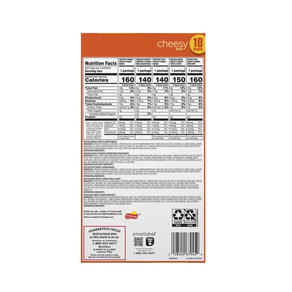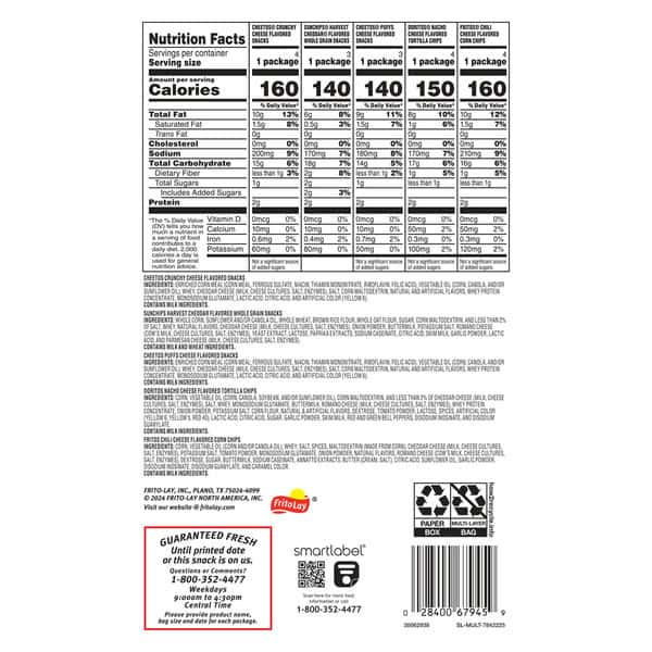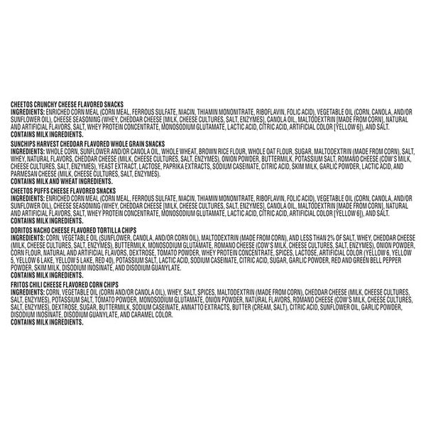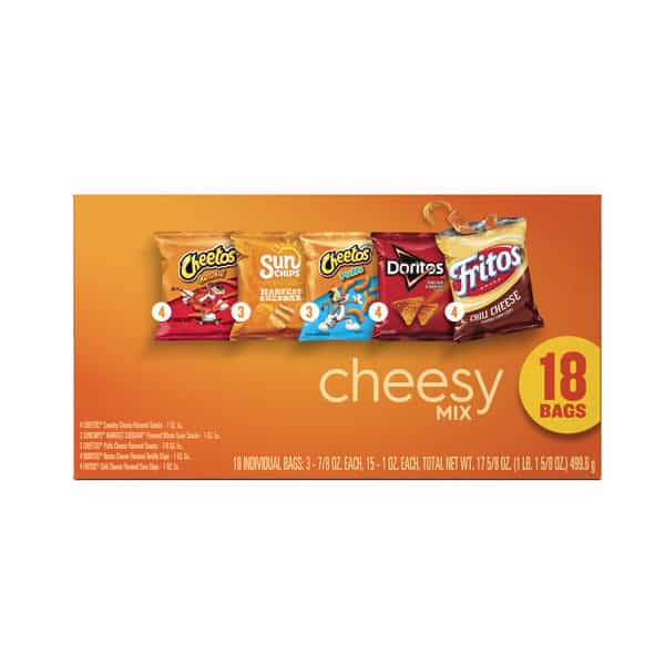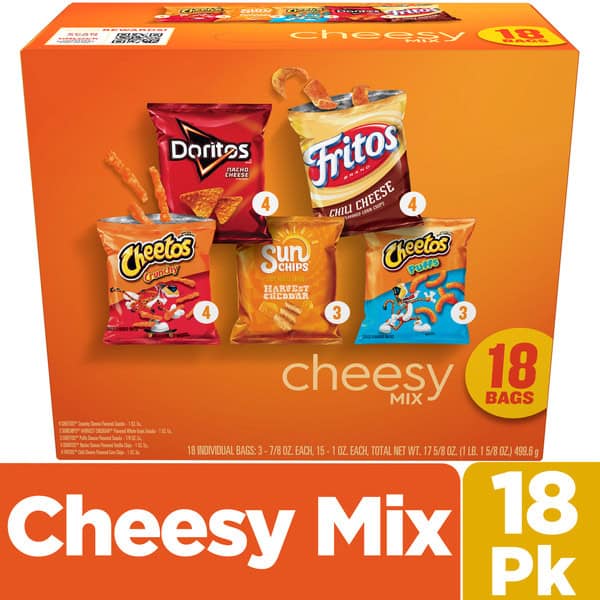 • Includes 18 Frito Lay Snacks Cheesy Mix Variety Pack: (4) Cheetos Crunchy, (3) Sunchips Harvest Cheddar, (3) Cheetos Puffs, (4) Doritos Nacho Cheese and (4) Fritos Chili Cheese