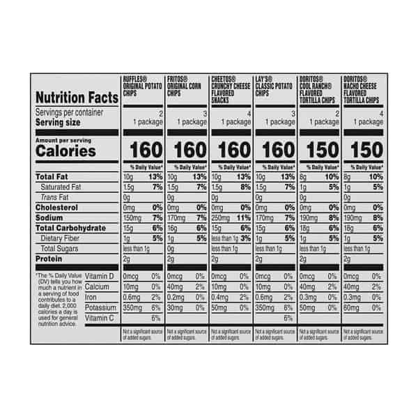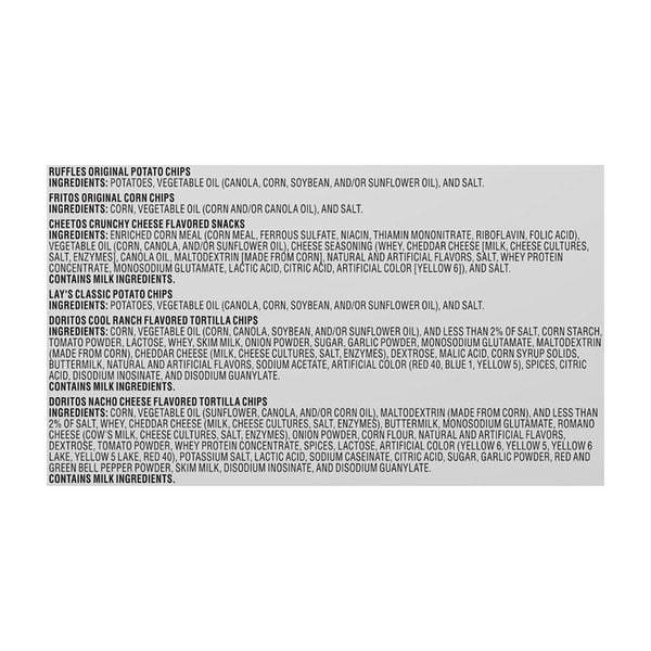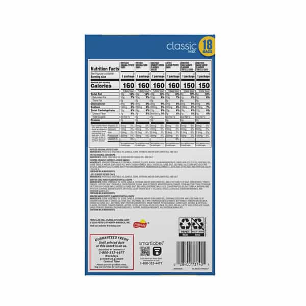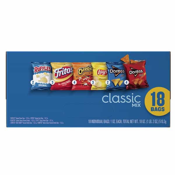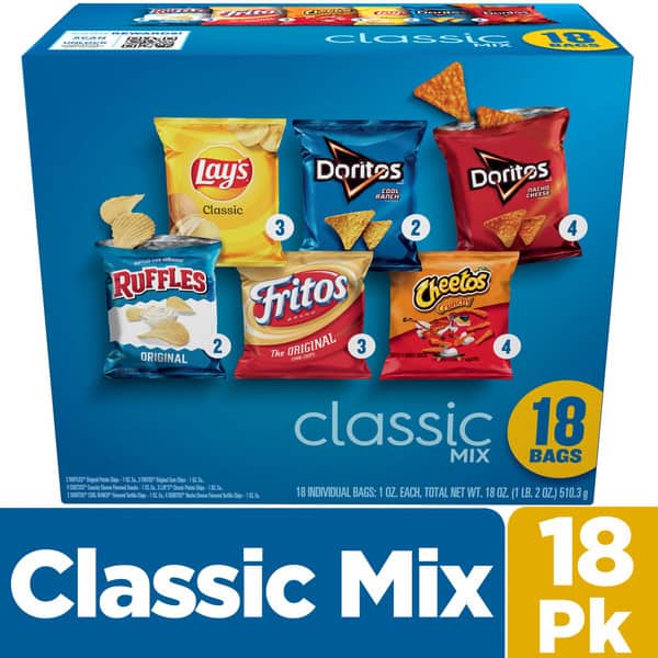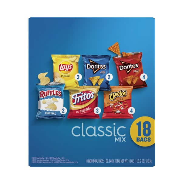 • Includes 18(1 oz) Frito Lay Snacks Classic Mix Variety Pack: (3) Lay’s Classic, (2) Doritos Cool Ranch, (4) Doritos Nacho Cheese, (2) Ruffles Original, (3) Fritos Original and (4) Cheetos Crunchy