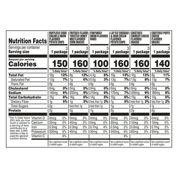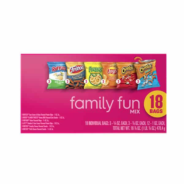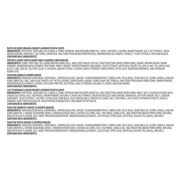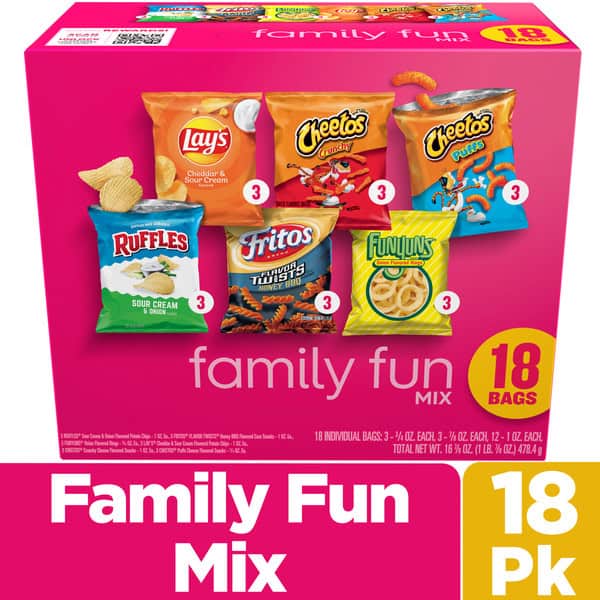 • Includes 18 Frito Lay Snacks Family Fun Mix Variety Pack: (3) Lay’s Cheddar & Sour Cream, (3) Cheetos Crunchy, (3) Cheetos Puffs, (3) Ruffles Sour cream & Onion, (3) Fritos Flavor Twists honey BBQ and (3) Funyuns Onion Flavored Rings