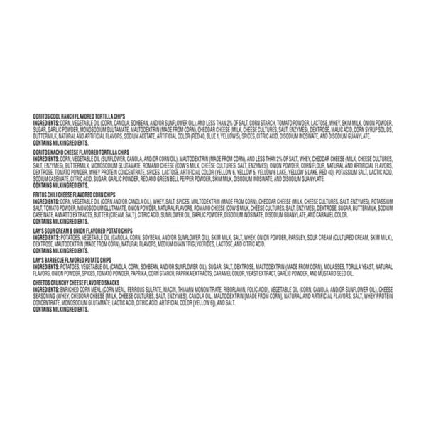 Doritos Ranch Flavored Tortilla Chips Ingredients: Corn, Vegetable Oil (corn, Canola, Soybean, And/or Sunflower Oil), And Less Than 2% Of Salt, Corn Starch, Tomato Powder, Lactose, Whey, Skim Milk, Onion Powder, Sugar, Garlic Powder, Monosodium Glutamate, Corn Maltodextrin, Potassium Salt, Cheddar Cheese (milk, Cheese Cultures, Salt, Enzymes), Dextrose, Malic Acid, Corn Syrup Solids, Buttermilk, Natural And Artificial Flavors, Sodium Acetate, Artificial Color (red 40, Blue L, Yellow 5), Spices, Citric Acid, Disodium Inosinate, And Disodium Guanylate. Contains Milk Ingredients. Doritos Nacho Cheese Flavored Tortilla Chips Ingredients: Corn, Vegetable Oil (sunflower, Canola, And/or Corn Oil), Maltodextrin (made From Corn), And Less Than 2% Of Salt, Whey, Cheddar Cheese (milk, Cheese Cultures, Salt, Enzymes), Buttermilk, Monosodium Glutamate, Romano Cheese (cows Milk, Cheese Cultures, Salt, Enzymes), Onion Powder, Corn Flour, Natural And Artificial Flavors, Dextrose, Tomato Powder, Whey Protein Concentrate, Spices, Lactose, Artificial Color (yellow 6, Yellow 5, Yellow 6 Lake, Yellow 5 Lake, Red 40), Potassium Salt, Lactic Acid, Sodium Caseinate, Citric Acid, Sugar, Garlic Powder, Red And Green Bell Pepper Powder, Skim Milk, Disodium Inosinate, And Disodium Guanylate. Contains Milk Ingredients. Fritos Chili Cheese Flavored Corn Chips Ingredients: Corn, Vegetable Oil (corn And/or Canola Oil), Whey, Salt, Spices, Maltodextrin Made From Corn), Cheddar Cheese (milk, Cheese Cultures, Salt, Enzymes), Potassium Salt, Tomato Powder, Monosodium Glutamate, Onion Powder, Natural Flavors, Romano E (cows Milk, Cheese Cultures, Enzymes), Dextrose, Sugar, Buttermilk, Sodium Caseinate, Annatto Extracts, Butter (cream, Salt), Citric Acid, Sunflower Oil, Garlic Powder, Disodium Inosinate, Disodium Guanylate, And Caramel Color. Contains Milk Ingredients. Lay’s Sour Cream & Onion Flavored Potato Chips Ingredients: Potatoes, Vegetable Oil Canola, Corn, Soybean, And/or Sunflower Oil , Skim Milk, Salt, Whey, Onion Powder, Parsley, Sour Cream (cultured Cream, Skim Milk), Dextrose, Maltodextrin (made From C Rn), Natural Flavors, Medium Chain Triglyceries, Lactose, And Citric Acid Contains Milk Ingredients. Lay’s Barbecue Flavored Potato Chips Ingredients: Potatoes, Vegetable Oil (canola, Corn, Soybean, And/or Sunflower Oil), Sugar, Salt, Dextrose, Maltodextrin (made From Corn), Molasses, Torula Yeast, Natural Flavors, Onion Powder, Spices, Tomato Powder, Paprika, Corn Starch, Paprika Extracts, Caramel Color, Yeast Extract, Garlic Powder, And Mustard Seed Oil Cheetos Crunchy Cheese Flavored Snacks Ingredients: Enriched Corn Meal (corn Meal, Ferrous Sulfate, Niacin, Thiamin Mononitrate, Riboflavin, Folic Acid), Vegetable Oil (corn, Canola, And/or Sunflower Oil), Cheese Seasoning (whey, Cheddar Cheese [milk, Cheese Cultures, Salt, Enzymes], Canola Oil, Maltodextrin [made From Corn], Natural And Artificial Flavors, Salt, Whey Protein Concentrate, Monosodium Glutamate, Lactic Acid, Citric Acid, Artificial Color [yellow And Salt. Contains Milk Ingredients.