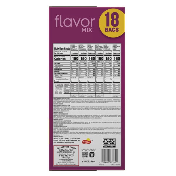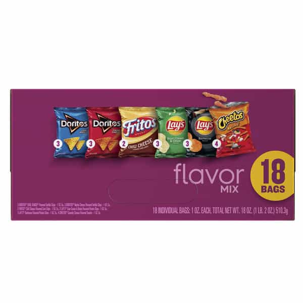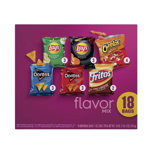 • Includes 18(1 oz ) Frito Lay Snacks Flavor Mix Variety Pack: (3) Doritos Cool Ranch, (2) Fritos Chili Cheese, (3) Lay’s Barbecue, (3) Doritos Nacho Cheese, (3) lay’s Sour Cream & Onion, and (4) Cheetos Crunchy