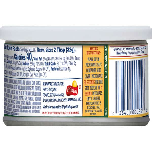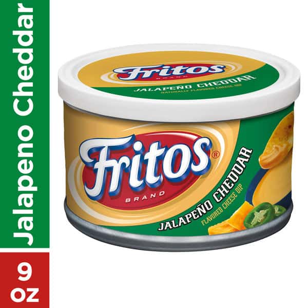 Frito-Lay Dips Delicious, crowd pleasing, and convenient – it can’t get much better than Frito-Lay Chips and Dips. Whether entertaining friends, enjoying a family barbeque, or relaxing at home, our perfectly blended salsas, great tasting cheese and bean dips, and rich dairy dips are always a hit. Mix and match them to discover your own perfect chip/dip pairing! Fritos Jalapeno Cheddar Cheese Dip is infused with the great taste of jalapeno and cheddar cheese, in a convenient package. It contains no gluten ingredients and has 0g trans fat. What’s In The Box- Fritos Dips, Jalapeno and Cheddar Cheese, 9 oz