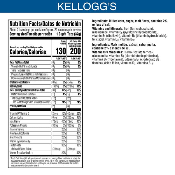 Milled Corn, Sugar, Malt Flavor, Contains 2% Or Less Of Salt, Vitamins And Minerals: Iron (ferric Phosphate), Niacinamide, Vitamin B₆ (pyridoxine Hydrochloride), Vitamin B₂ (riboflavin), Vitamin B₁ (thiamin Hydrochloride), Folic Acid, Vitamin D₃, Vitamin B₁₂
