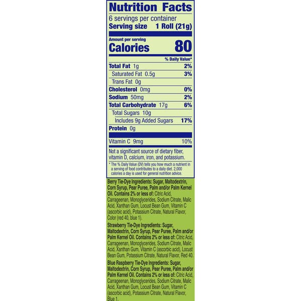 Berry Tie-dye Ingredients: Sugar, Maltodextrin, Corn Syrup, Pear Puree Concentrate, Palm Oil. Contains 2 % Or Less Of: Carrageenan, Citric Acid, Monoglycerides, Sodium Citrate, Acetylated Monoglycerides, Malic Acid, Xanthan Gum, Vitamin C (ascorbic Acid), Locust Bean Gum, Potassium Citrate, Natural Flavor, Color (red 40, Blue 1), Strawberry Tie-dye Ingredients: Sugar, Maltodextrin, Corn Syrup, Pear Puree Concentrate, Palm Oil. Contains 2% Or Less Of: Carrageenan, Citric Acid, Monoglycerides, Sodium Citrate, Acetylated Monoglycerides, Malic Acid, Xanthan Gum, Vitamin C (ascorbic Acid), Locust Bean Gum, Potassium Citrate, Natural Flavor, Red 40, Blue Raspberry Tie-dye Ingredients: Sugar, Maltodextrin, Corn Syrup, Pear Puree Concentrate, Palm Oil. Contains 2% Or Less Of: Carrageenan, Citric Acid, Monoglycerides, Sodium Citrate, Acetylated Monoglycerides, Malic Acid, Xanthan Gum, Vitamin C (ascorbic Acid), Locust Bean Gum, Potassium Citrate, Natural Flavor, Blue 1