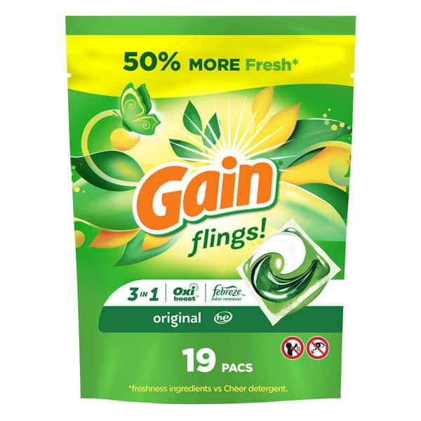 Stains and odor got you down? Turn that frown upside-down and make your nose happy with Gain Original scent Laundry Detergent flings!, the only detergent that combines OxiBoost + Febreze all-in-one laundry detergent pac. It’s made with 50% more freshness ingredients*, so you get fresh fabrics with every load. And because it’s Gain, there’s no shortage of irresistible scent that keeps you sniffing again and again. With its great cleaning power, this laundry soap not only smells fantastic but also cleans exceptionally well, providing you with excellent results wash after wash. Whether you’re using regular or high-efficiency washers, place theGain Original scent Laundry Detergent flings! in your washing machine drum, then add your clothes with the certainty of knowing you’ll get that clean in any machine, even in cold water.Take your laundry experience to the next level when you dive nose first into the world of Gain! Gain is the only laundry brand that can give you the same scent throughout the entire wash process!Whether you’re sniffing around for a detergent, a fabric softener, scent boosters, or dryer sheets, we have the scents you’ll swoon over, especially when you use the same scent from start to finish!* vs. Cheer detergent