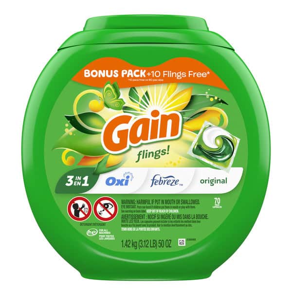Stains and odor got you down? Turn that frown upside-down and make your nose happy with Gain Original scent Laundry Detergent flings!, the only detergent that combines OxiBoost + Febreze all-in-one laundry detergent pac. It’s made with 50% more freshness ingredients*, so you get fresh fabrics with every load. And because it’s Gain, there’s no shortage of irresistible scent that keeps you sniffing again and again. With its great cleaning power, this laundry soap not only smells fantastic but also cleans exceptionally well, providing you with excellent results wash after wash. Whether you’re using regular or high-efficiency washers, place theGain Original scent Laundry Detergent flings! in your washing machine drum, then add your clothes with the certainty of knowing you’ll get that clean in any machine, even in cold water.Take your laundry experience to the next level when you dive nose first into the world of Gain! Gain is the only laundry brand that can give you the same scent throughout the entire wash process!Whether you’re sniffing around for a detergent, a fabric softener, scent boosters, or dryer sheets, we have the scents you’ll swoon over, especially when you use the same scent from start to finish!* vs. Cheer detergent