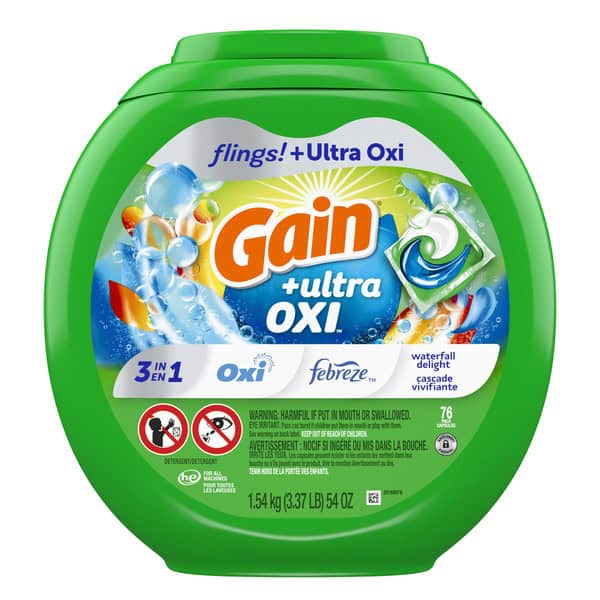 Gain Flings Ultra OXI Laundry Detergent Pacs Waterfall Delight Scent 3-in-1 HE Compatible Laundry Soap is designed with oxi power to lift away stubborn dirt, infusing your clothes with an amazing Gain Waterfall Delight scent that’s sure to become one of your favorites. Gain Flings Laundry Detergent is easy to use and even easier on the nose. Fight dirty and smell fresh with a flick of the wrist when you toss a Gain OXI flings into the wash. Gain Flings Ultra OXI Laundry Detergent Waterfall Delight uses an exclusive 3-in-1 formulation of OXI Boost, Febreze, and Waterfall Delight scent to give you a freshness that’s sure to become a household favorite. Experience for yourself the crisp, waterfall-freshness clean of Gain Flings Ultra OXI Laundry Detergent Waterfall Delight today.