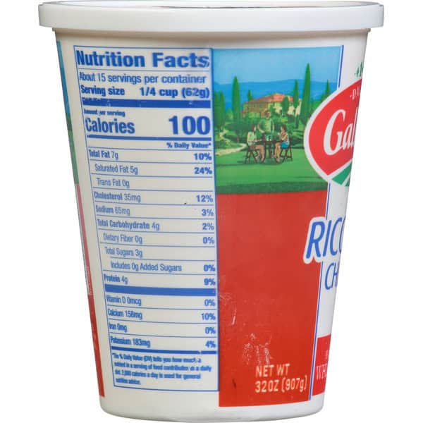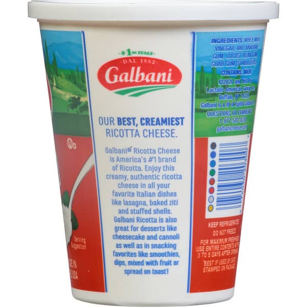 Enjoy this creamy, authentic ricotta cheese in all your favorite Italian dishes like lasagna, baked ziti and stuffed shells. Galbani Ricotta is also great for desserts like cheesecake and cannoli as well as in snacking favorites like smoothies, dips, mixed with fruit or spread on toast! To learn more, visit galbanicheese.com. Questions or comments? 1-877-522-8254. Product of USA.