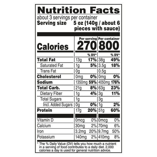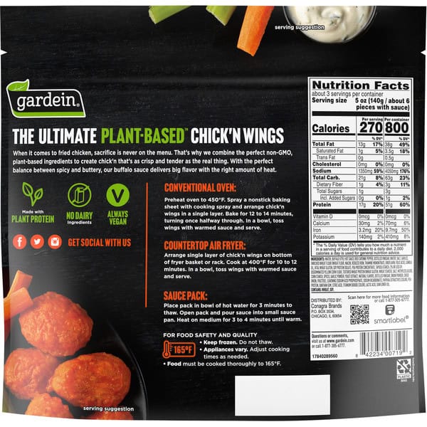 Cook thoroughly. Conventional Oven: Preheat oven to 450 degrees F. Spray a nonstick baking sheet with cooking spray and arrange chick’n wings in a single layer. Bake for 12 to 14 minutes, turning once halfway through. In a bowl, toss wings with warmed sauce and serve. Countertop Air Fryer: Arrange single layer of chick’n wings on bottom of fryer basket or rack. Cook at 400 degrees F for 10 to 12 minutes. In a bowl, toss wings with warmed sauce and serve. Sauce Pack: Place pack in bowl of hot water for 3 minutes to thaw. Open pack and pour sauce into small sauce pan. Heat on medium for 3 to 4 minutes until warm. For Food Safety and Quality: Keep frozen. Do not thaw. Appliances vary. Adjust cooking times as needed. Food must be cooked thoroughly to 165 degrees F.