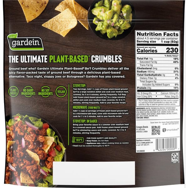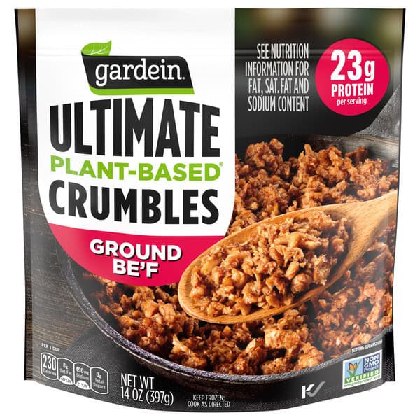 The ultimate plant-based crumbles. Ground beef who? Gardein Ultimate Plant-Based Be’f Crumbles deliver all the juicy flavor-packed taste of ground beef through a delicious plant-based alternative. Taco night, sloppy joes or Bolognese? Gardein has you covered. Plant based.