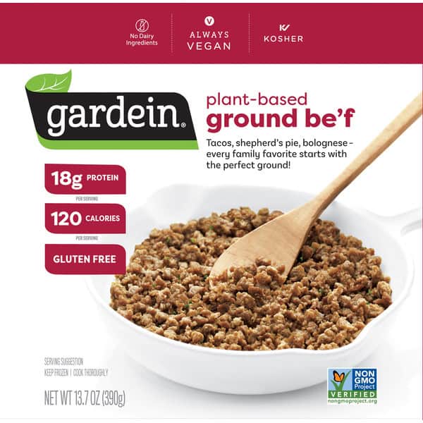 Gardein bolognese bring your favorite home-made or jarred red pasta sauce to a simmer over medium heat, add gardein frozen ground be’f and continue to simmer for 3-5 minutes until hot throughout. Meanwhile, boil pasta according to package directions. Serve bolognese sauce over cooked pasta and garnish with fresh chopped basil and grated mozzarella or parmesan cheese (or vegan option). Plant-based ground be’f tacos saute gardein ground be’f according to cooking directions above. Add taco seasoning and set aside. Warm up tacos shells and add ground be’f, salsa, guacamole, shredded cheese (or vegan option), and shredded lettuce. Serve with hot sauce and lime wedges and roasted corn. Or skip the shells, serve over lettuce and enjoy a taco salad!