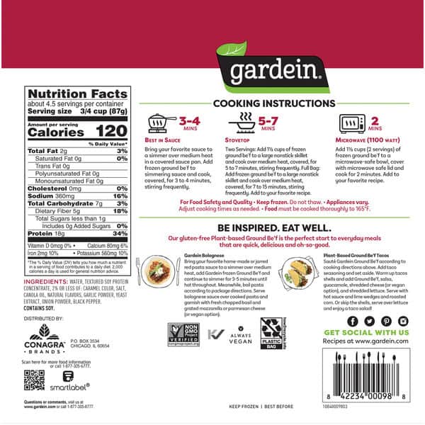 Tacos, shepherd’s pie, bolognese – every family favorite starts with the perfect ground! 18 g protein per serving. 120 calories per serving. Gluten free. Always vegan. No dairy ingredients. Non GMO Project Verified. nongmoproject.org. Be inspired. Eat well. Our gluten-free plant-based ground be’f is the perfect start to everyday meals that are quick, delicious and oh-so-good. www.gardein.com. how2recycle.info. Smartlabel: Scan here for more food information or call 1-877-305-6777. Facebook. Twitter. Pinterest. Instagram. Get social with us. Questions or comments, visit us at www.gardein.com or call 1-877-305-6777. Recipes at www.gardein.com.