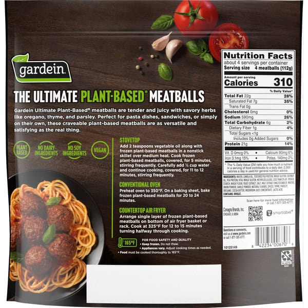 Make all your favorite recipes meatless without sacrificing flavor with Gardein Ultimate Plant-Based Meatballs. These juicy and tender meatballs are made with zesty seasonings and deliver all the texture and taste of traditional meatballs … while cooking just like them too. Perfect for plant-based pastas, party appetizers or anytime you need to cook with a delicious meat alternative, these frozen meatballs have 19 grams of protein per serving. They are also Non-GMO Project Verified and contain no soy ingredients so you can put your mind at ease while making the next meal easy. Skip the meat for a meal, or for good, without skipping your favorite foods. Gardein: Your Favorite Foods Made Meatless.