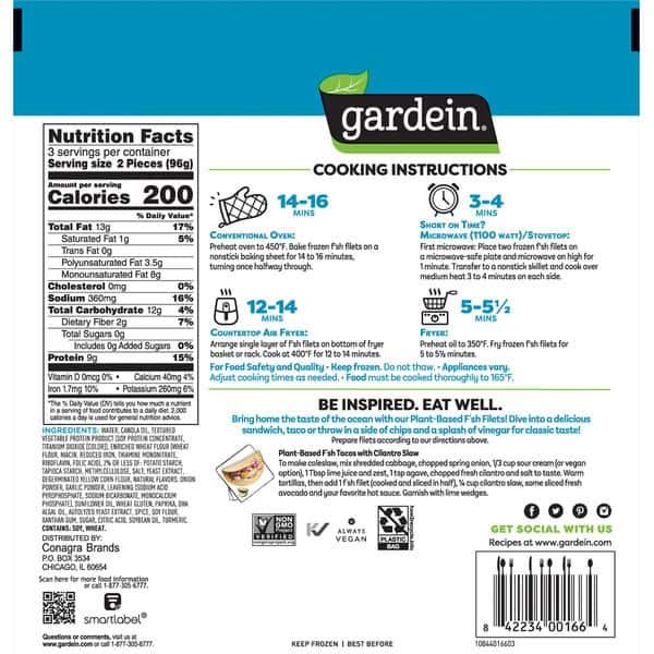 Coated in a light golden tempura batter, Gardein Golden Fishless Filets are the best vegan catch ever. Tender and flaky, these plant-based filets contain omega-3s, have no cholesterol and contain 9 grams of protein per serving. In 10 minutes, these Gardein frozen fishless filets make a delicious flexitarian option any day of the week.
