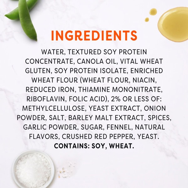 Water, Textured Soy Protein Concentrate, Canola Oil, Vital Wheat Gluten, Soy Protein Isolate, Enriched Wheat Flour (wheat Flour, Niacin, Reduced Iron, Thiamine Mononitrate, Riboflavin, Folic Acid), 2% Or Less Of: Methylcellulose, Yeast Extract, Onion Powder, Salt, Barley Malt Extract, Spices, Garlic Powder, Sugar, Fennel, Natural Flavors, Crushed Red Pepper, Yeast.