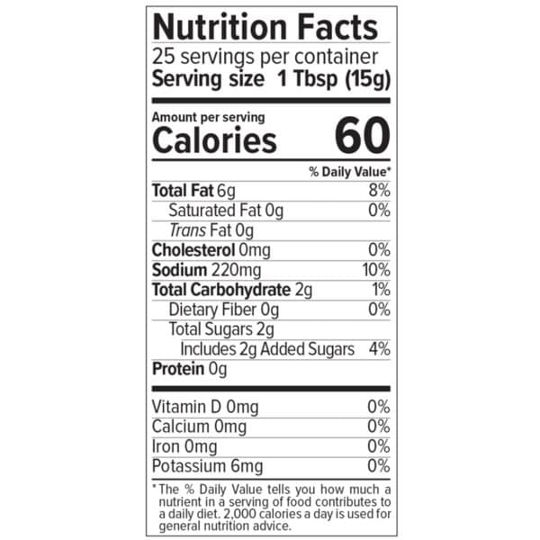 Apple Cider Vinegar, Expeller-Pressed Canola Oil, Cane Sugar, Garlic Cloves, Salt, Spices, & Xanthan Gum