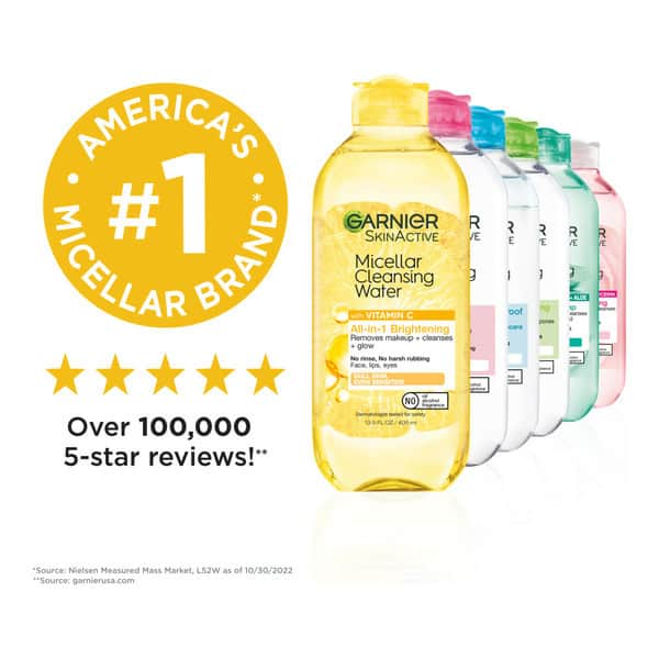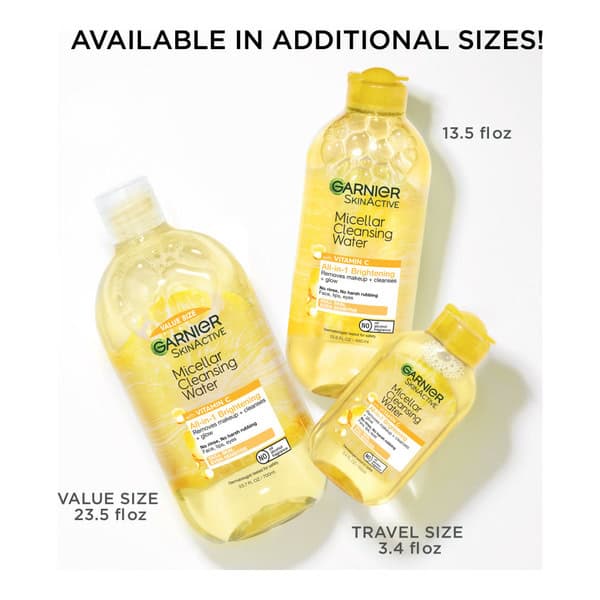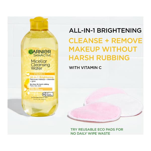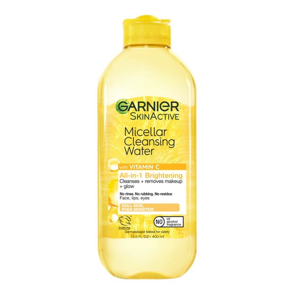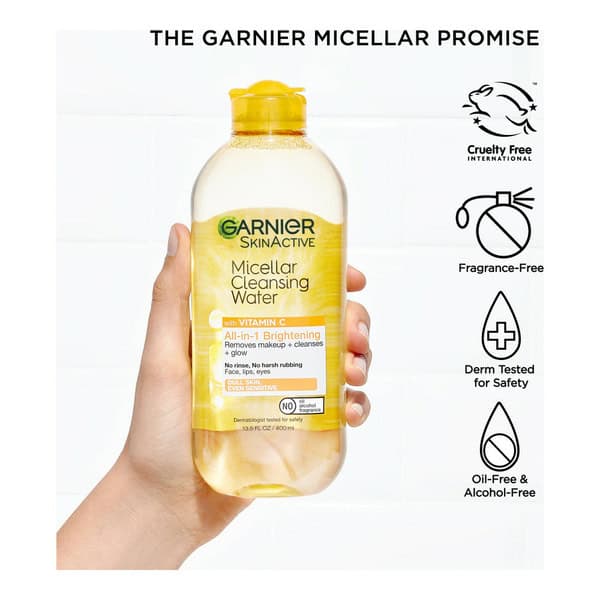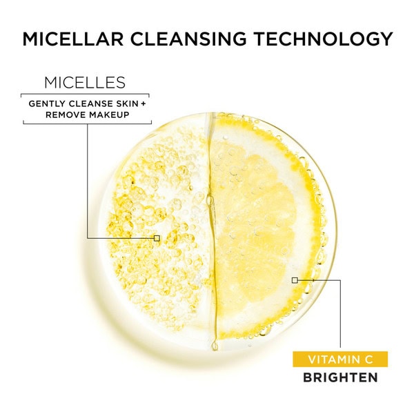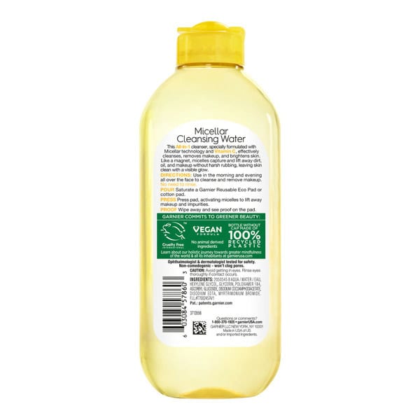 • This all-in-1 brightening micellar cleanser water is a facial cleanser and makeup remover that is surprisingly powerful, yet gentle on skin. The Garnier Micellar Cleansing Water with Vitamin C works for all skin types. It effectively cleanses, removes makeup and boosts glow. Like a magnet, micelles capture and lift away dirt, oil and makeup without harsh rubbing. This facial cleanser removes makeup, leaving skin perfectly clean without over drying. This Garnier Micellar Cleansing Water with Vitamin C is gentle on skin and can be used to remove face makeup and eye makeup. The gentle cleanser is cruelty-free, vegan and formulated without alcohol, oils, fragrance, parabens, and sulfates.