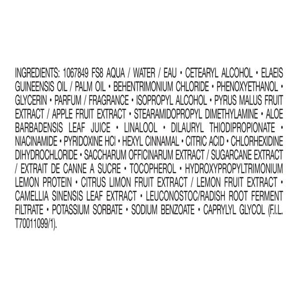 1067849 Fs5, Aqua/water, Cetearyl Alcohol, Elaeis Guineensis Oil/palm Oil, Behentrimonium Chloride, Phenoxyethanol, Glycerin, Fragrance, Isopropyl Alcohol, Pyrus Malus Fruit Extract/apple Fruit Extract, Stearamidopropyl Dimethylamine, Bht, Aloe Barbadensis Leaf Juice, Linalool, Niacinamide, Pyridoxine Hcl, Hexyl Cinnamal, Citric Acid, Chlorhexidine Dihydrochloride, Saccharum Officinarum Extract/sugar Cane Extract, Tocopherol, Hydroxypropyltrimonium Lemon Protein, Citrus Limon Peel Extract/lemon Peel Extract, Leuconostoc/radish Root Ferment Filtrate, Camellia Sinensis Leaf Extract, Potassium Sorbate, Sodium Benzoate, F.i.l. D210008/1