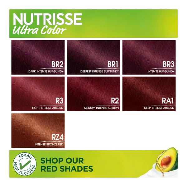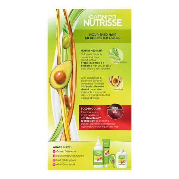 • Garnier Nutrisse Ultra Color Hair Color is a permanent hair dye for all hair textures with triple nourishing oils – avocado, olive, and shea