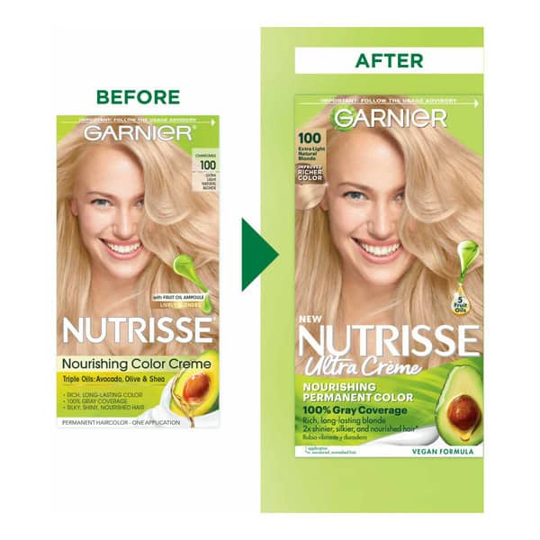 • Garnier Nutrisse Ultra Crème Nourishing Permanent Color nourishes as it colors for 2x shinier, silkier and nourished hair vs. uncolored, unwashed hair. Garnier Nutrisse comes with a fruit oil ampoule that you pour directly into the mix. Our nourishing after color conditioner is infused with five responsibly-sourced oils– avocado, olive, coconut, argan and shea. The new ColorBoost technology efficiently infuses intense dyes into the hair fiber for richer, radiant, and long-lasting color with 100 percent gray coverage. Our non-drip color Crème adapts to all hair textures for even color with beautiful highlights. Garnier Nutrisse is cruelty free and available in over 70 vegan shades – formulated without animal derived ingredients.
