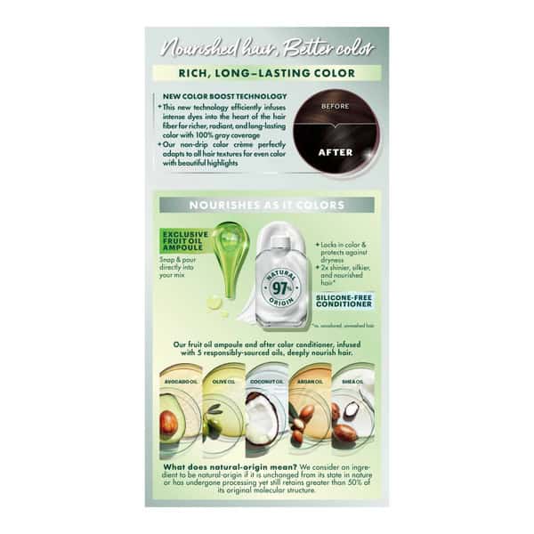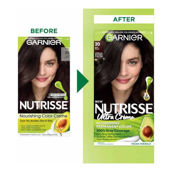 • Garnier Nutrisse Ultra Crème Nourishing Permanent Color nourishes as it colors for 2x shinier, silkier and nourished hair vs. uncolored, unwashed hair. Garnier Nutrisse comes with a fruit oil ampoule that you pour directly into the mix. Our nourishing after color conditioner is infused with five responsibly-sourced oils– avocado, olive, coconut, argan and shea. The new ColorBoost technology efficiently infuses intense dyes into the hair fiber for richer, radiant, and long-lasting color with 100 percent gray coverage. Our non-drip color Crème adapts to all hair textures for even color with beautiful highlights. Garnier Nutrisse is cruelty free and available in over 70 vegan shades – formulated without animal derived ingredients.