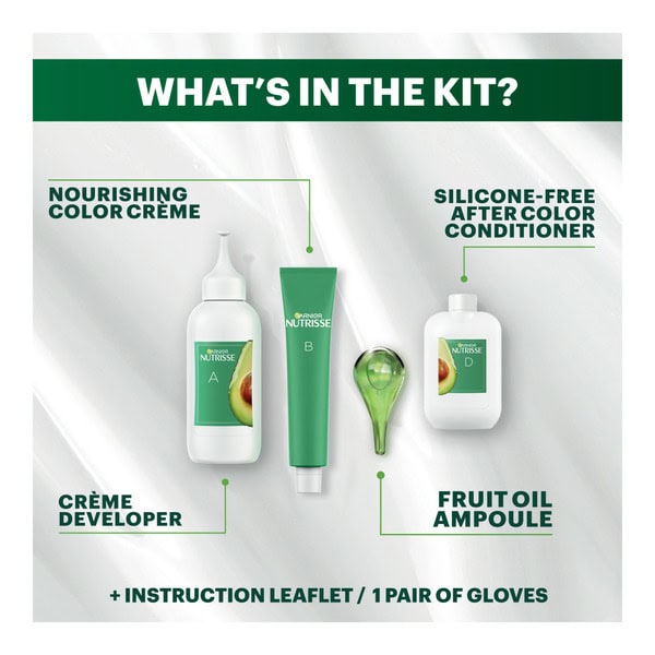 • Garnier Nutrisse Hair dye is the only hair color Crème with a separate fruit oil ampoule that you snap and pour directly into the mix
