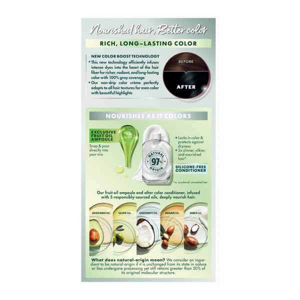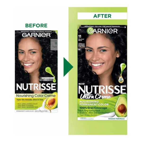 • Garnier Nutrisse Ultra Crème Nourishing Permanent Color nourishes as it colors for 2x shinier, silkier and nourished hair vs. uncolored, unwashed hair. Garnier Nutrisse comes with a fruit oil ampoule that you pour directly into the mix. Our nourishing after color conditioner is infused with five responsibly-sourced oils– avocado, olive, coconut, argan and shea. The new ColorBoost technology efficiently infuses intense dyes into the hair fiber for richer, radiant, and long-lasting color with 100 percent gray coverage. Our non-drip color Crèmeadapts to all hair textures for even color with beautiful highlights. Garnier Nutrisse is cruelty free and available in over 70 vegan shades – formulated without animal derived ingredients.