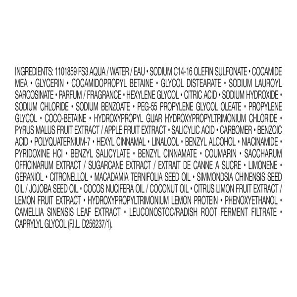 1101859 Fs3 – Aqua / Water, Cocamidopropyl Betaine, Disodium Laureth Sulfosuccinate, Sodium Lauryl Sulfoacetate, Sodium Lauroyl Sarcosinate, Decyl Glucoside, Glycol Distearate, Sodium Chloride, Fragrance, Polyquaternium-10, Ppg-5-ceteth-20, Sodium Benzoate, Carbomer, Pyrus Malus Fruit Extract/apple Fruit Extract, Sodium Hydroxide, Peg-55 Propylene Glycol Oleate, Salicylic Acid, Propylene Glycol, Acrylates Copolymer, Hexyl Cinnamal, Linalool, Benzoic Acid, Benzyl Alcohol, Niacinamide, Pyridoxine Hcl, Benzyl Salicylate, Benzyl Cinnamate, Citric Acid, Coumarin, Saccharum Officinarum Extract / Sugarcane Extract, Limonene, Geraniol, Sodium Acetate, Citronellol, Macadamia Ternifolia Seed Oil, Glycerin, Simmondsia Chinensis Seed Oil/jojoba Seed Oil, Cocos Nucifera Oil/coconut Oil, Hydroxypropyltrimonium Lemon Protein, Isopropyl Alcohol, Phenoxyethanol, Citrus Limon Fruit Extract/lemon Fruit Extract, Leuconostoc/radish Root Ferment Filtrate, Camellia Sinensis Leaf Extract, F.i.l.# D192303/1