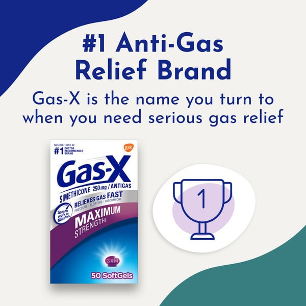 From the #1 Anti-Gas Relief Brand comes Gas-X Maximum Strength Gas Relief Softgels with Simethicone 250 mg deliver fast relief of gas pressure, bloating and discomfort. These maximum strength simethicone softgels go to work in minutes, rescuing you from embarrassing situations and helping you get back to feeling like yourself. Gas-X uses 250 mg simethicone to break up gas bubbles in your stomach and intestines. Once this trapped gas is broken down, your body can deal with the gas naturally. These fast gas relief pills come in convenient softgels, making them portable and easy to swallow. Adults and children 12 years of age and older may take one or two simethicone 250 mg softgels as needed, not to exceed two softgels in 24 hours unless directed by a doctor. Gas-X is the name you turn to when you need serious gas relief. Trust Gas-X, the #1 doctor recommended OTC anti-gas product. (1)
