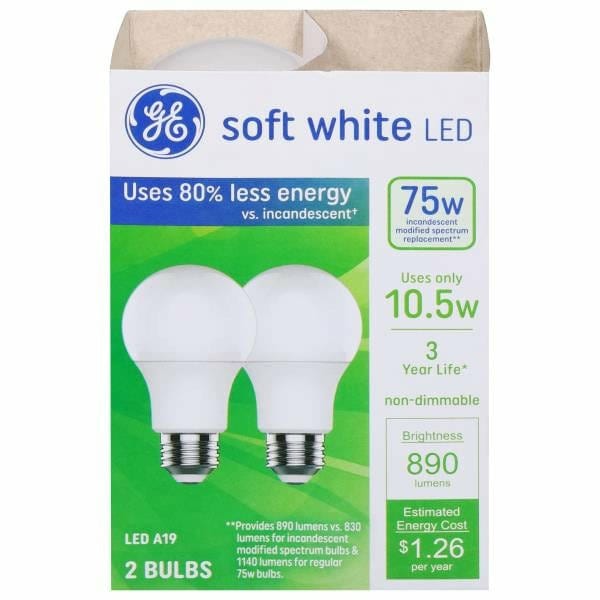Brightness Quantity: 890 lumens. Energy Info: $1.26 Based on 3 hrs/day, 11 cent/kWh cost depends on rates and use. 10.5 watts. Package Info: 2-Pack. 2. Bulb Info: Both. LED. Screw. Bulb Life: 3 years Based on 3 hrs/day Bulb Appearance: 2700 K .