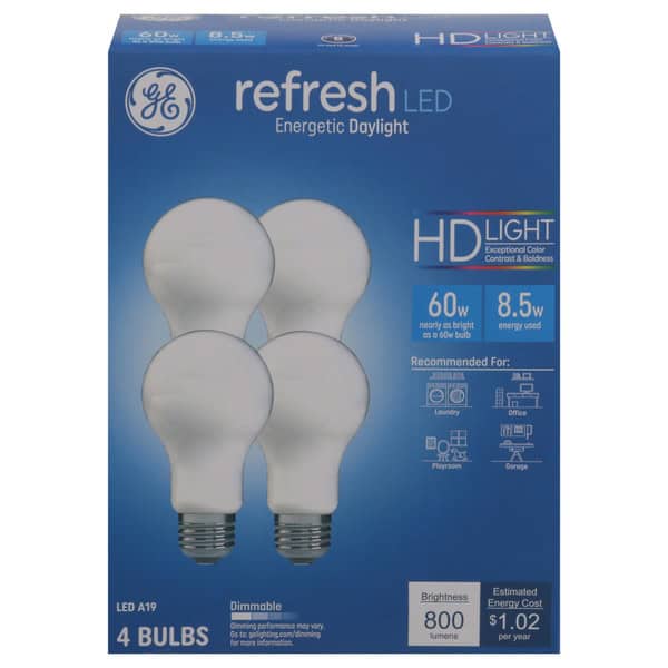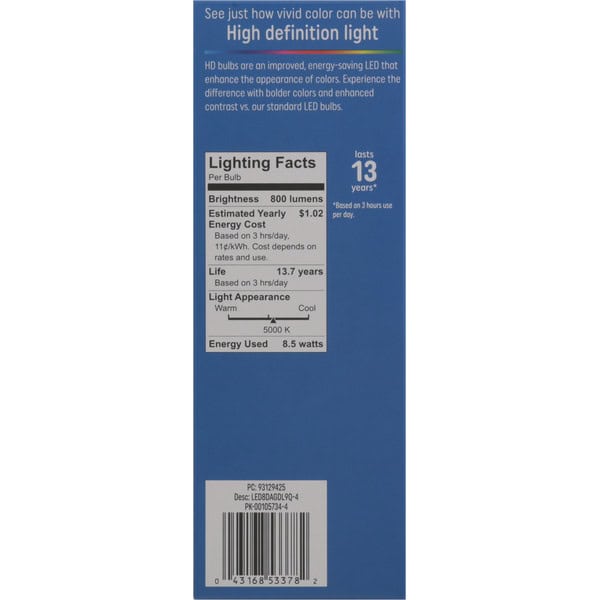 Brightness Quantity: 800 lumens. Energy Info: $1.02 based on 3 hrs/day, 11 cents/kWh. Cost depends on rates and use. 8.5 watts. Package Info: 4-Pack. 4. Voltage: . Bulb Info: LED. Is Dimmable. Screw. Bulb Life: 13.7 years based on 3 hrs/day. Bulb Appearance: 5000 k.