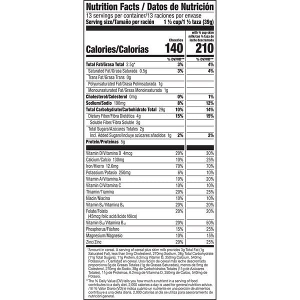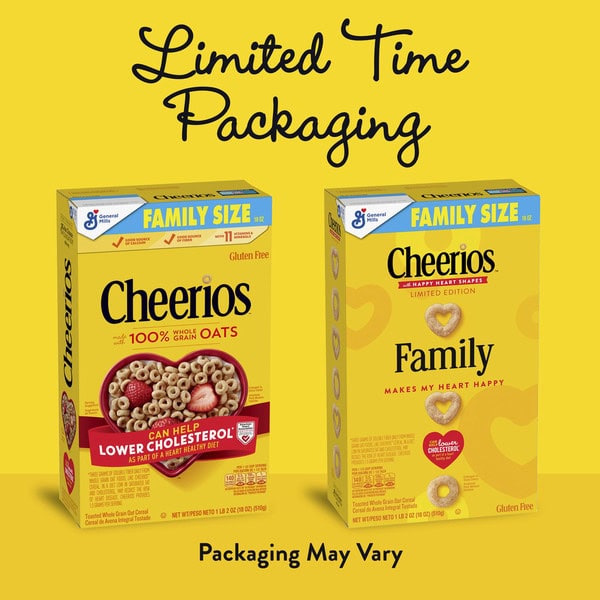 Start your day O-so-right with Cheerios Cereal, made with 100% whole grain oats. These little Os with soluble fiber can help lower cholesterol* as part of a heart healthy diet. *Three grams of soluble fiber daily from whole grain oat foods, like Cheerios Cereal, in a diet low in saturated fat and cholesterol, may reduce the risk of heart disease. Cheerios provides 1.5g per serving. Dig into a bowl of this heart healthy cereal with milk as a delicious and wholesome addition to your morning. Every serving of this gluten free, toasted whole grain oat cereal provides 34g of whole grain (at least 48g recommended daily), a good source of calcium and fiber, and 11 vitamins and minerals, with no artificial flavors or colors. Beyond a heart healthy breakfast food for adults, this whole grain cereal makes a quick, gluten free kids snack by the handful. It’s even easy to take some cereal to go! Just pack crispy Os in a lunch box or backpack for yummy school snacks. Make it an ingredient in your favorite homemade cereal bars. Or sprinkle some Cheerios in homemade trail mix recipes as tasty snacks for adults. There are 13 servings in this Cheerios Cereal family size box. However you enjoy these tasty little Os, they’re a part of General Mills cereals, spreading goodness from tots to grown-ups.