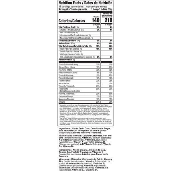 Whole Grain Oats, Corn Starch, Sugar, Salt, Tripotassium Phosphate, Vitamin E (mixed Tocopherols) Added To Preserve Freshness, Vitamins And Minerals: Calcium Carbonate, Iron And Zinc (mineral Nutrients), Vitamin C (sodium Ascorbate), A B Vitamin (niacinamide), Vitamin B₆ (pyridoxine Hydrochloride), Vitamin A (palmitate), Vitamin B₁ (thiamin Mononitrate), A B Vitamin (folic Acid), Vitamin B₁₂, Vitamin D₃