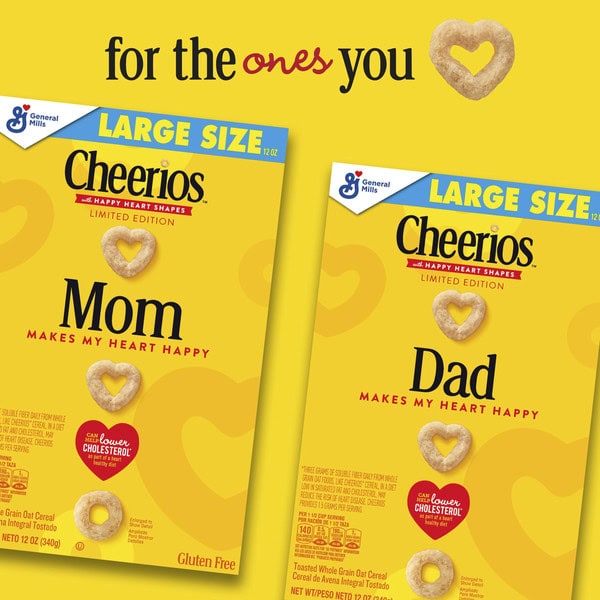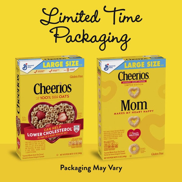 Start your day O-so-right with Cheerios Cereal, made with 100% whole grain oats. These little Os with soluble fiber can help lower cholesterol* as part of a heart healthy diet. *Three grams of soluble fiber daily from whole grain oat foods, like Cheerios Cereal, in a diet low in saturated fat and cholesterol, may reduce the risk of heart disease. Cheerios provides 1.5g per serving. Dig into a bowl of this heart healthy cereal with milk as a delicious and wholesome addition to your morning. Every serving of this gluten free, toasted whole grain oat cereal provides 34g of whole grain (at least 48g recommended daily), a good source of calcium and fiber, and 11 vitamins and minerals, with no artificial flavors or colors. Beyond a heart healthy breakfast food for adults, this whole grain cereal makes a quick, gluten free kids snack by the handful. It’s even easy to take some cereal to go! Just pack crispy Os in a lunch box or backpack for yummy school snacks. Make it an ingredient in your favorite homemade cereal bars. Or sprinkle some Cheerios in homemade trail mix recipes as tasty snacks for adults. There are about 8 servings in this Cheerios Cereal large size box. However you enjoy these tasty little Os, they’re a part of General Mills cereals, spreading goodness from tots to grown-ups.