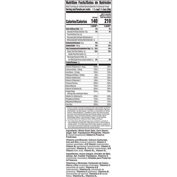 Whole Grain Oats, Corn Starch, Sugar, Salt, Tripotassium Phosphate, Vitamin E (mixed Tocopherols) Added To Preserve Freshness, Vitamins And Minerals: Calcium Carbonate, Iron And Zinc (mineral Nutrients), Vitamin C (sodium Ascorbate), A B Vitamin (niacinamide), Vitamin B₆ (pyridoxine Hydrochloride), Vitamin A (palmitate), Vitamin B₁ (thiamin Mononitrate), A B Vitamin (folic Acid), Vitamin B₁₂, Vitamin D₃