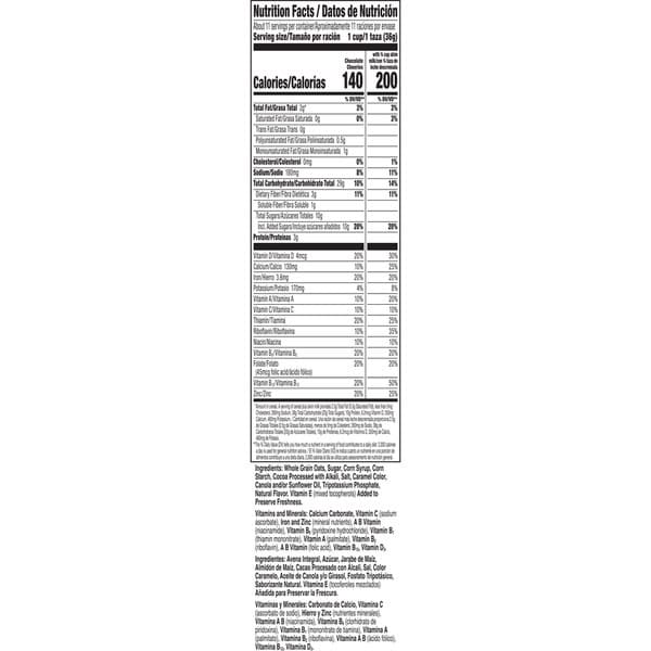 Whole Grain Oats, Sugar, Corn Syrup, Corn Starch, Cocoa Processed With Alkali, Salt, Caramel Color, Canola And/or Sunflower Oil, Unsweetened Chocolate, Tripotassium Phosphate, Natural Flavor, Vitamin E (mixed Tocopherols) Added To Preserve Freshness, Vitamins And Minerals: Calcium Carbonate, Vitamin C (sodium Ascorbate), Iron And Zinc (mineral Nutrients), A B Vitamin (niacinamide), Vitamin B₆ (pyridoxine Hydrochloride), Vitamin B₁ (thiamin Mononitrate), Vitamin A (palmitate), Vitamin B₂ (riboflavin), A B Vitamin (folic Acid), Vitamin B₁₂, Vitamin D₃