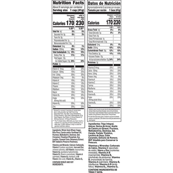 Whole Grain Wheat, Sugar, Rice Flour, Canola And/or Sunflower Oil, Fructose, Maltodextrin, Dextrose, Salt, Cinnamon, Trisodium Phosphate, Soy Lecithin, Caramel Color, Bht Added To Preserve Freshness, Vitamins And Minerals: Calcium Carbonate, Vitamin C (sodium Ascorbate), Iron And Zinc (mineral Nutrients), A B Vitamin (niacinamide), Vitamin B₆ (pyridoxine Hydrochloride), Vitamin B₁ (thiamin Mononitrate), Vitamin A (palmitate), Vitamin B₂ (riboflavin), A B Vitamin (folic Acid), B₁₂, Vitamin D₃