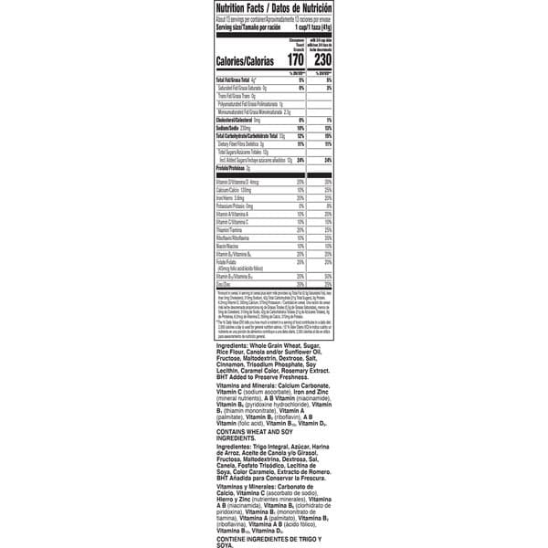 Whole Grain Wheat, Sugar, Rice Flour, Canola And/or Sunflower Oil, Fructose, Maltodextrin, Dextrose, Salt, Cinnamon, Trisodium Phosphate, Soy Lecithin, Caramel Color, Bht Added To Preserve Freshness, Vitamins And Minerals: Calcium Carbonate, Vitamin C (sodium Ascorbate), Iron And Zinc (mineral Nutrients), A B Vitamin (niacinamide), Vitamin B₆ (pyridoxine Hydrochloride), Vitamin B₁ (thiamin Mononitrate), Vitamin A (palmitate), Vitamin B₂ (riboflavin), A B Vitamin (folic Acid), Vitamin B₁₂, Vitamin D₃