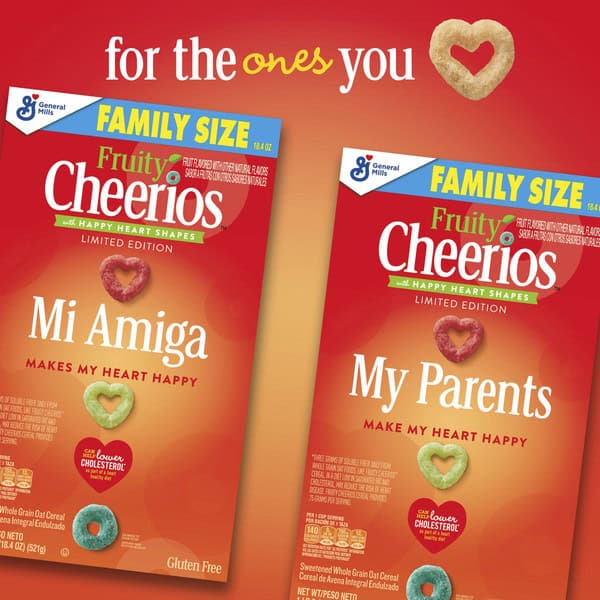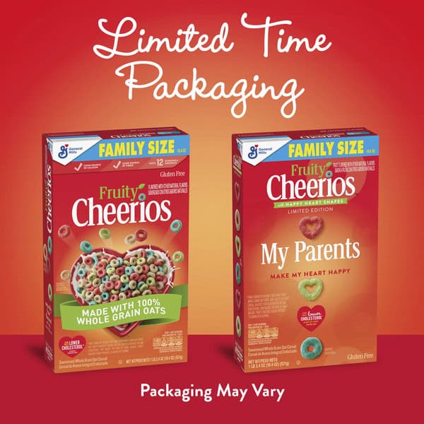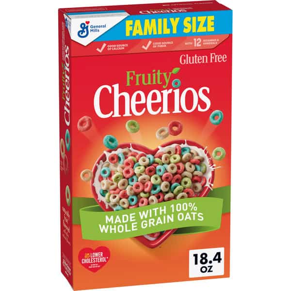 Colorful little Os that serve up fruity fun for everyone! Naturally flavored with other natural flavors, Fruity Cheerios bring great taste by the bowlful. This sweetened whole grain oat cereal is made with 100% whole grain oats and no artificial flavors. Each serving has a good source of both calcium and fiber, with 12 vitamins and minerals. Eating Fruity Cheerios can help lower cholesterol* as part of a heart healthy diet. *Three grams of soluble fiber daily from whole grain oat foods, like Fruity Cheerios Cereal, in a diet low in saturated fat and cholesterol, may reduce the risk of heart disease. Fruity Cheerios provides .75 grams per serving. This cereal is also gluten free, with 21g whole grain per serving (at least 48g recommended daily). Keep a cereal box in your pantry as an easy addition to breakfast. Try some cereal with or without cold milk as a snack. Sprinkle some over yogurt as part of a tasty, gluten free breakfast on the go. Whether you make it your go-to morning food or serve some as crispy kids snacks, General Mills cereals spread goodness from tots to grown-ups. Contains one cardboard box of crunchy Fruity Cheerios, Heart Healthy Gluten Free Breakfast Cereal, Family Size, 18.4 oz; perfect for instant snacking, or a part of breakfast and meals.