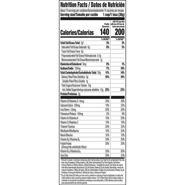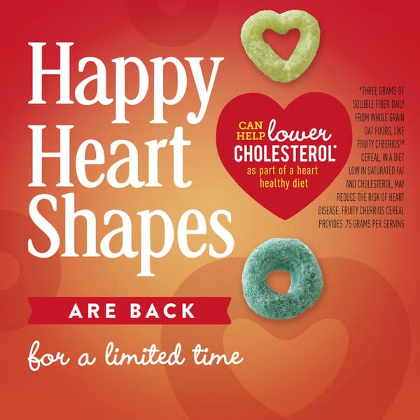 • CAN HELP LOWER CHOLESTEROL* as part of a heart healthy diet; *3g soluble fiber daily from whole grain oat foods, in a diet low in saturated fat and cholesterol, may reduce the risk of heart disease – Fruity Cheerios cereal provides .75g per serving