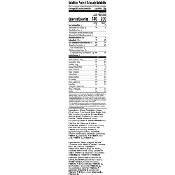 Whole Grain Oats, Sugar, Corn Syrup, Corn Starch, Pear Puree, Salt, Tripotassium Phosphate, Natural Flavor, Red 40, Sodium Citrate, Citric Acid, Vitamin E (mixed Tocopherols) Added To Preserve Freshness, Turmeric Extract (color), Blue 1. Vitamins And Minerals: Calcium Carbonate, Vitamin C (sodium Ascorbate), Iron And Zinc (mineral Nutrients), A B Vitamin (niacinamide), Vitamin B6 (pyridoxine Hydrochloride), Vitamin B1 (thiamin Mononitrate), Vitamin A (palmitate) Vitamin B2 (riboflavin), A B Vitamin (folic Acid), Vitamin B12, Vitamin D3.