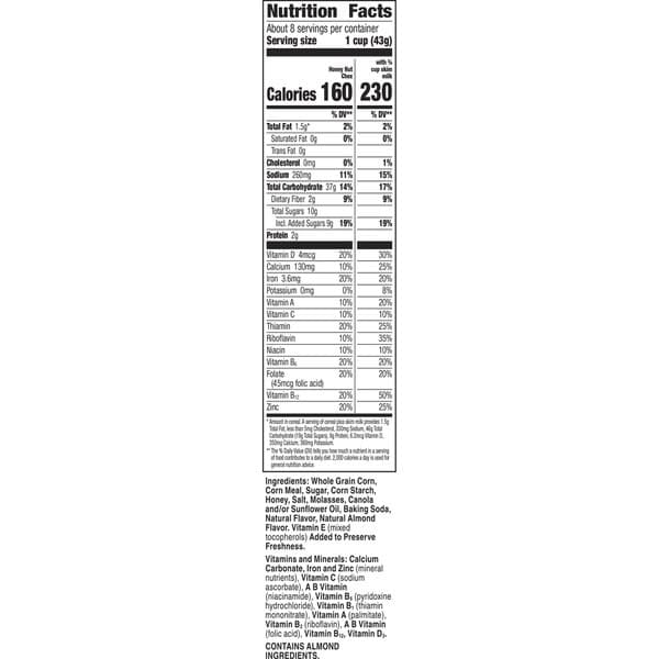 Whole Grain Corn, Corn Meal, Sugar, Corn Starch, Honey, Salt, Molasses, Canola And/or Sunflower Oil, Baking Soda, Natural Flavor, Natural Almond Flavor, Vitamin E (mixed Tocopherols) Added To Preserve Freshness, Vitamins And Minerals: Calcium Carbonate, Zinc And Iron (mineral Nutrients), Vitamin C (sodium Ascorbate), A B Vitamin (niacinamide), Vitamin B₆ (pyridoxine Hydrochloride), Vitamin B₁ (thiamin Mononitrate), Vitamin A (palmitate), Vitamin B₂ (riboflavin), A B Vitamin (folic Acid), Vitamin B₁₂, Vitamin D₃