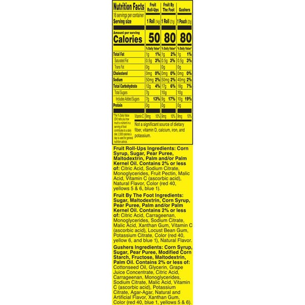 Fruit Roll-ups – Corn, Syrup, Sugar, Pear Puree, Maltodextrin, Palm And/or Pam Kernel Oil, Contains 2% Or Less Of: Citric Acid, Sodium Citrate, Monoglycerides, Fruit Pectin, Malic Acid, Vitamin C (ascorbic Acid), Natural Flavor, Color (red 40, Yellow 5 & 6, Blue 1),fruit By The Foot – Sugar, Maltodextrin, Corn Syrup, Pear Puree Concentrate, Palm Oil, Contains 2% Or Less Of: Carrageenan, Citric Acid, Monoglycerides, Sodium Citrate, Acetylated Monoglycerides, Malic Acid, Xanthan Gum, Vitamin C (ascorbic Acid), Locust Bean Gum, Potassium Citrate, Color (red 40 And Yellow 6), Natural Flavor,gushers – Sugar, Corn Syrup, Dried Corn Syrup, Pear Puree Concentrate, Modified Corn Starch, Fructose, Maltodextrin, Palm Oil, Contains 2% Or Less Of: Cottonseed Oil, Glycerin, Grape Juice Concentrate, Carrageenan, Citric Acid, Monoglycerides, Sodium Citrate, Malic Acid, Vitamin C (ascorbic Acid), Natural Flavor, Potassium Citrate, Agar-agar, Xanthan Gum, Color (red 40, Blue 1, Yellow 5 & 6)