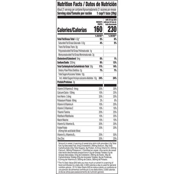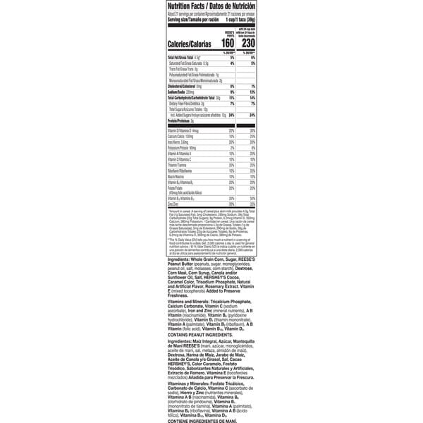 Whole Grain Corn, Sugar, Reese’s Peanut Butter (peanuts, Sugar, Monoglycerides, Peanut Oil, Salt, Molasses, Corn Starch), Dextrose, Corn Meal, Corn Syrup, Canola And/or Sunflower Oil, Salt, Hershey’s Cocoa, Caramel Color, Trisodium Phosphate, Natural And Artificial Flavor, Vitamin E (mixed Tocopherols) Added To Preserve Freshness, Vitamins And Minerals: Tricalcium Phosphate, Calcium Carbonate, Vitamin C (sodium Ascorbate), Iron And Zinc (mineral Nutrients), A B Vitamin (niacinamide), Vitamin B₆ (pyridoxine Hydrochloride), Vitamin B₁ (thiamin Mononitrate), Vitamin A (palmitate), Vitamin B₂ (riboflavin), A B Vitamin (folic Acid), Vitamin B₁₂, Vitamin D₃